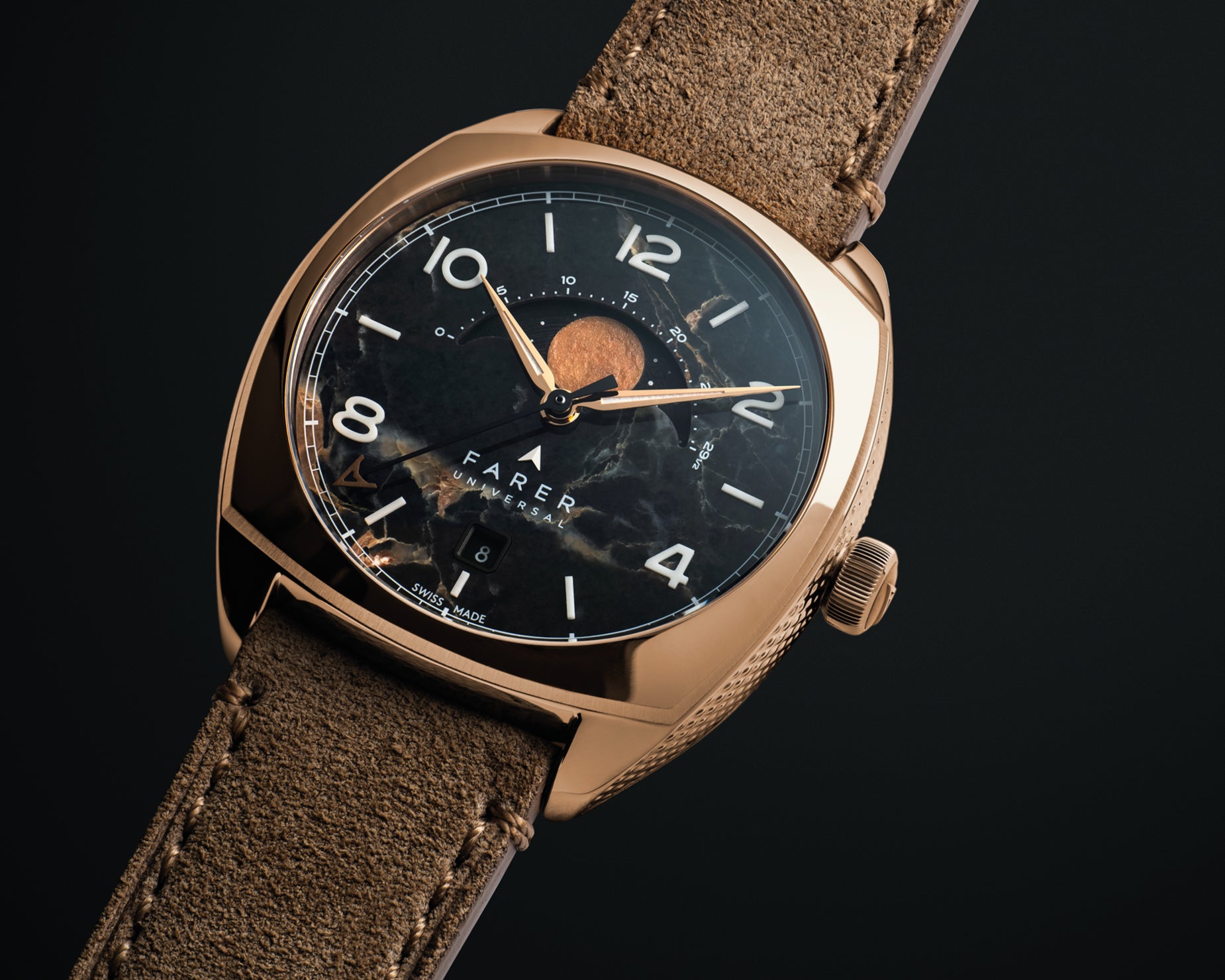 The Moonphase collection offers a fresh interpretation of one of the oldest complications in watchmaking. The moon is hand-painted in Geneva, Switzerland using Grade OL X1 Super-LumiNova, which makes for a striking sight during both day and night. Each model in the collection has a different coloured moon, which is inspired by the different shades the moon can appear under certain conditions.