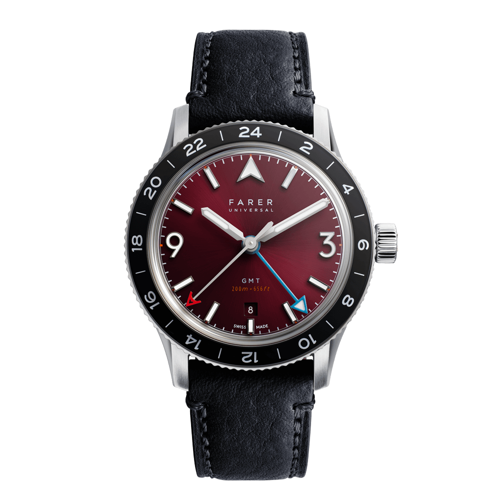 The Crooms is a Farer classic thanks to its combination of an exceptionally clean design and bold colour. With its uncluttered layout, your eye is immediately drawn to the rich burgundy dial with its luxurious sunburst finish. Onto this striking dial are mounted the polished hour markers, which are a mix of sleek batons, interspersed with numerals at three and nine, and the Farer logo at twelve. The batons are notched at the tips so that the minute track cuts into them. At 5-minute intervals, the minute track’s print switches to a bold orange. Meanwhile, the hour and minute hands are polished bevelled swords, with a polished seconds hand that has a bright “postbox red” Farer logo at its tip. Lastly, the GMT hand is a saturated sky blue that provides the perfect contrast against the red dial. This GMT hand is used in conjunction with the bidirectional rotating bezel. Underneath a sapphire insert is a 24-hour scale that allows you to track a second time zone. Naturally, the Crooms is just as legible in the dark as in the light thanks to a heavy application of white X1 Super-LumiNova.