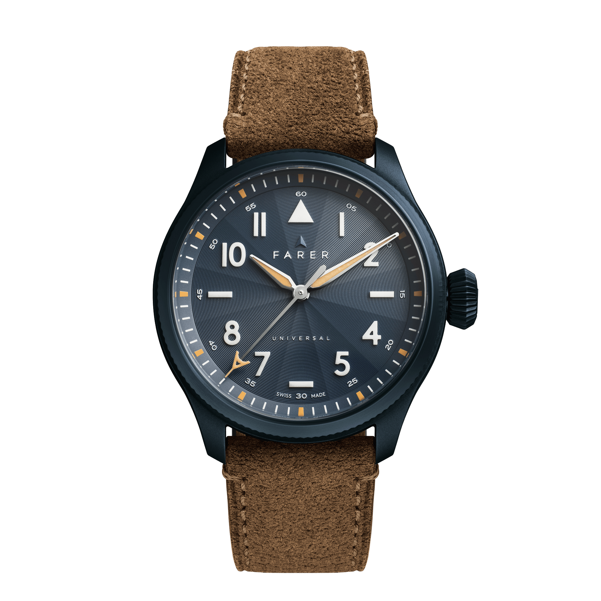 The applied 3D hour markers are in a classic aviation layout, with the numerals punctuated by an arrow at twelve, and batons at three, six, and nine. They’re made from Lumicast, a blend of ceramic and X2 Super-LumiNova to ensure a bright glow in low lighting. The lozenge-shaped handset is filled with pale yellow Super-LumiNova, and matches the Farer ‘A’ at the tip of the seconds hand, and the five-minute marks along the raised minute track. The Farer 'A' beneath twelve o'clock is applied, and the lettering "Farer" and "Universal" is raised slightly proud of the dial so that it is crisp and legible.