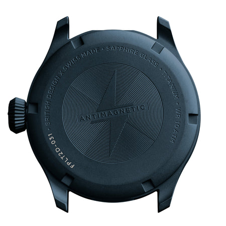 Anti-magnetic pilot watch with a 40mm blue PVD-coated titanium case and an automatic Swiss movement.