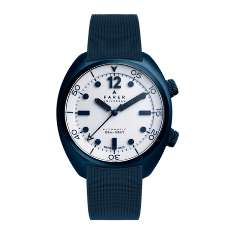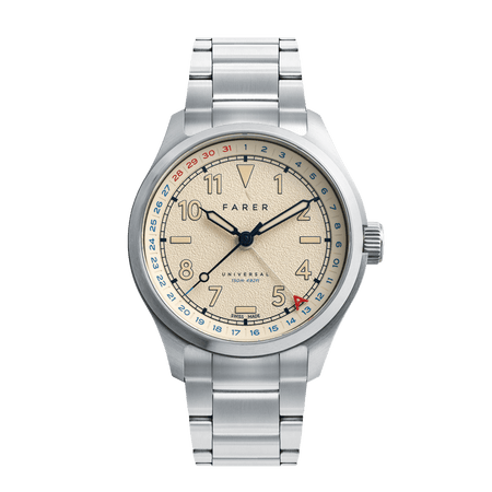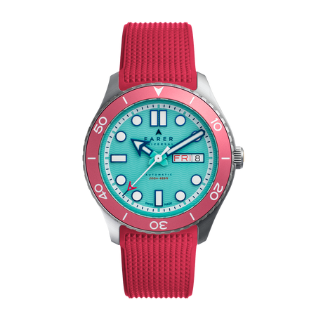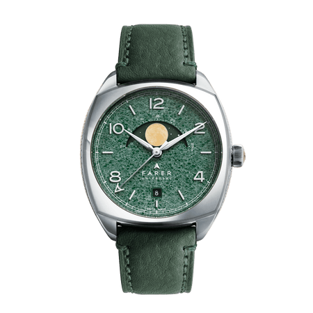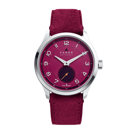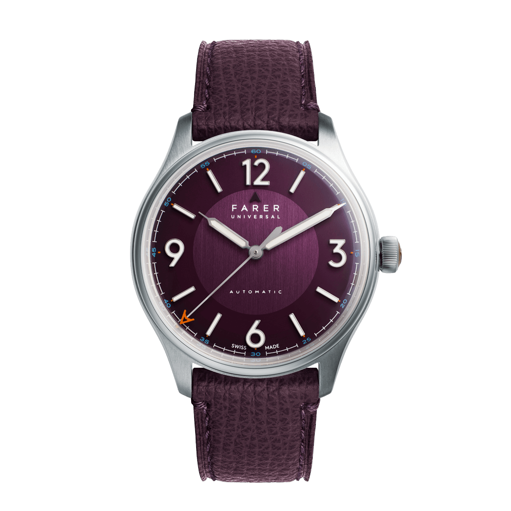 Discovery sets out a classic form with bold modernity, through the use of a special finish, vertical brushed purple sunray that floods the dial. Starting out as a deep purple, almost black, when viewed out of direct light, the sunray finish explodes with a kaleidoscopic effect of rich purple tones when hit with direct light. Applied mirror numerals and markers frame the chamfered purple dial, infilled in off-white Super-LumiNova with matching finish syringe-style hands and sweeping seconds tipped in a pop of burnt orange. A unique combination that juxtaposes an elegant timepiece with our unreserved love of colour.