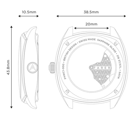 - Case size: 38.5mm x 43.8mm x 10.5mm