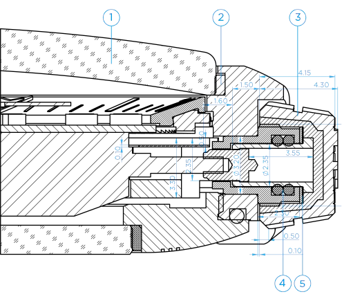 The movement crown (3) has 2 O’ring gaskets (4). The water resistance is 100m when the crown is unscrewed, by screwing the crown in, an additional gasket (5) is compressed to secure the full 300m rating.