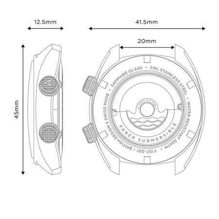 Solid titanium tapered crowns, inset with crosshatched bronze caps embossed with the Farer 'A'. The top crown sets the time, bottom crown operates an internal rotating bezel.