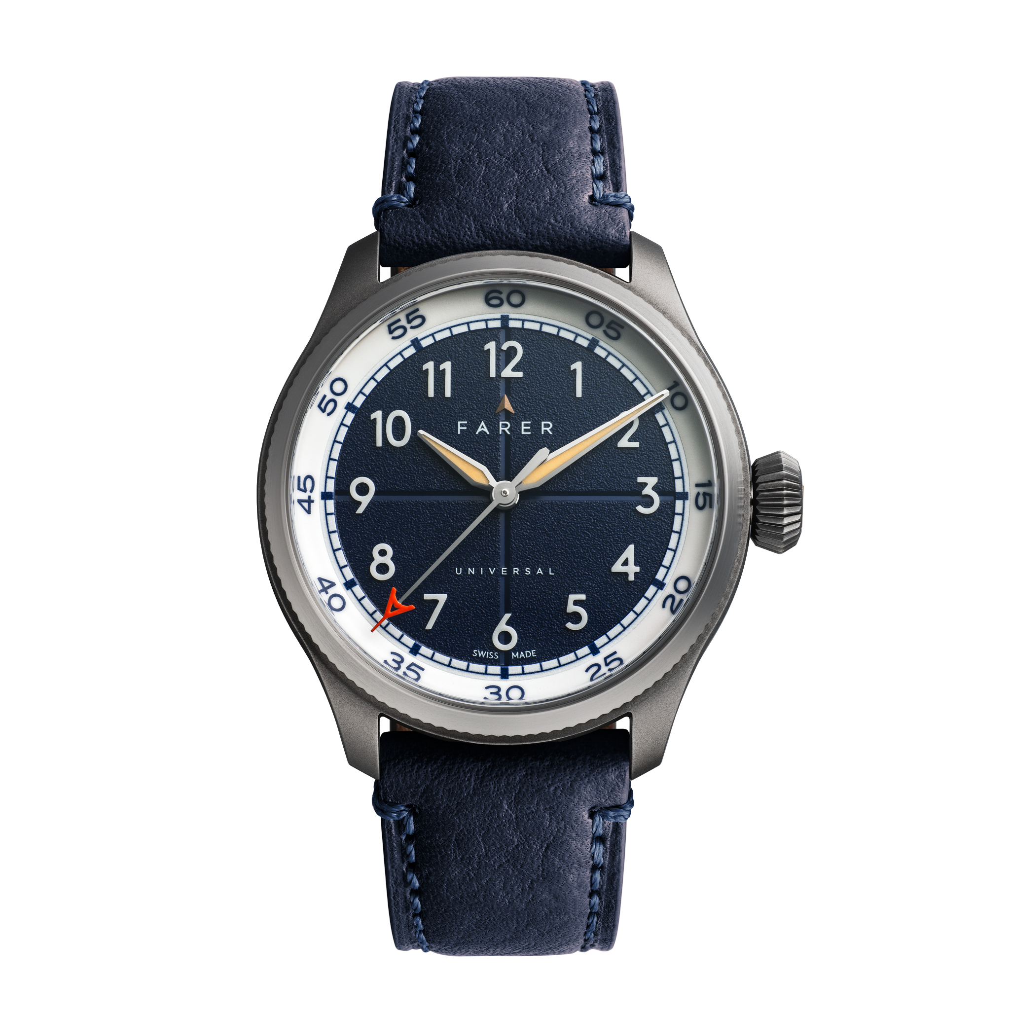 The Hewlett puts legibility first with a clean dial that features an oversized minute track and hour markers. The main dial is a rich ink blue with a finely textured surface punctuated by a deeply engraved crosshair. Highly luminous Lumicast numerals are mounted on top, and these are moulded from a mix of ceramic and Grade X2 Super-LumiNova. Surrounding these is a large raised minute track that’s also fully lumed, guaranteeing that the Hewlett is readable in any situation. The polished lozenge-shaped handset stands out thanks to its yellow Super-LumiNova infill, as does the bright red Farer ‘A’ at the tip of the seconds hand. The Farer 'A' beneath twelve o'clock is applied, and the lettering "Farer" and "Universal" is raised slightly proud of the dial so that it is crisp and legible.