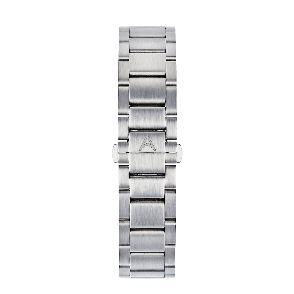 Oyster-style brushed stainless steel tapered bracelet with concealed push button butterfly clasp. The links are secured by screws for easy sizing, with half links to ensure a comfortable fit. Designed to fit our 39.5mm GMT and Three Hand cases, with flush-fitting end links and quick-release spring bars, that allow you to change the strap of your watch in seconds. We recommend taking your watch and bracelet to a reputable watch store or jeweller, who will measure your wrist and ensure an exact fit.