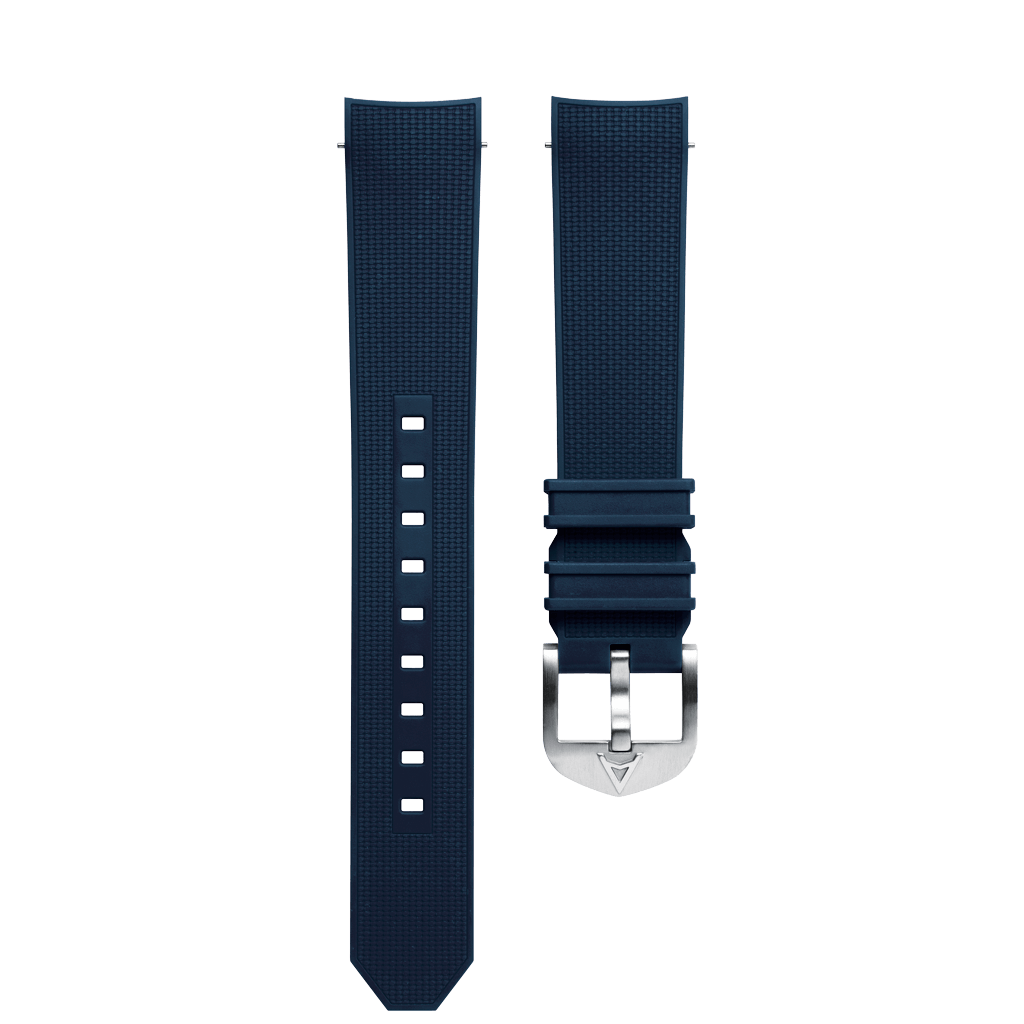 Navy natural rubber strap with oversized titanium buckle. Flush fitting to the Aqua Compressor case via quick-release spring bars, allowing you to change the strap of your watch in seconds.