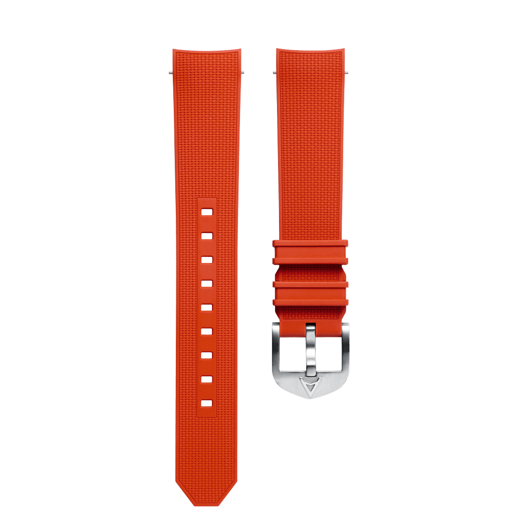 Orange natural rubber strap with oversized titanium buckle. Flush fitting to the Aqua Compressor case via quick-release spring bars, allowing you to change the strap of your watch in seconds.