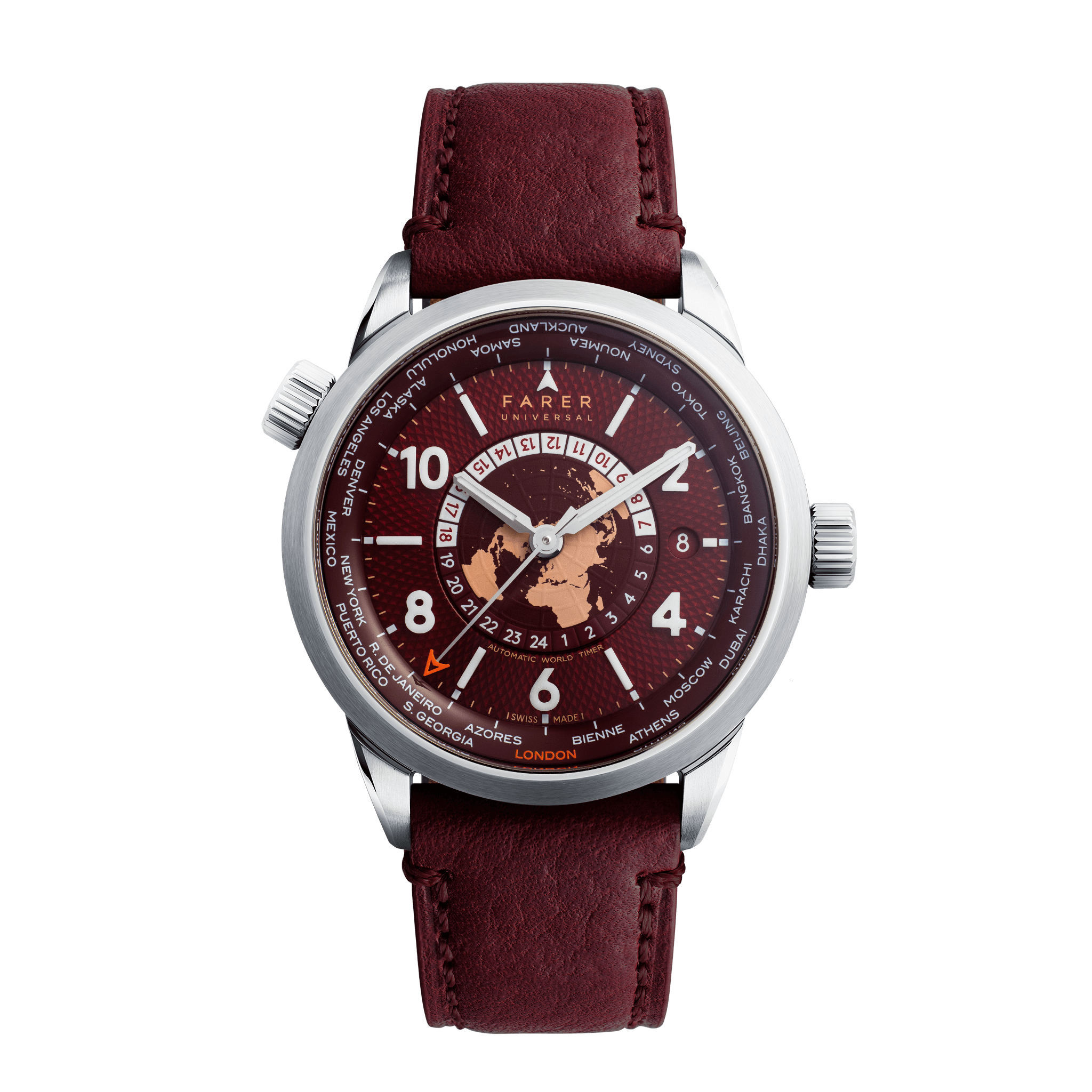 The Thorne gives the World Timer a bold new aesthetic with its burgundy colour palette. The main dial features an elegant guilloché pattern that is coated in a polished, clear lacquer to enhance the depth of both the colour and the pattern. The white numbers and batons mounted onto this surface are made from Lumicast, solid blocks of ceramic blended with Super-LumiNova. This ensures that they offer excellent clarity under any lighting conditions. The handset consists of polished alpha-shaped hour and minute hands, inset with Super-LumiNova, whilst the polished second hand has a burnt orange Farer 'A' tip.